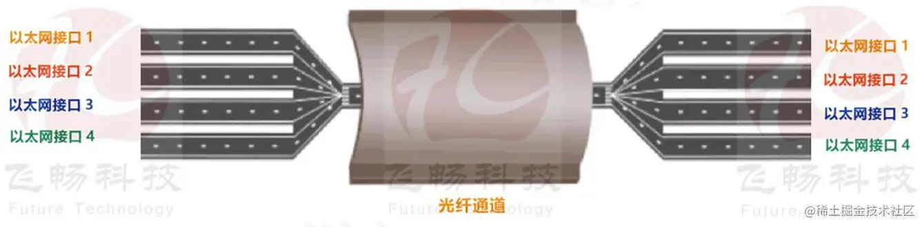 以上的图为物理隔离的 1 光 4 电光纤收发器的示意图:4 个以太网通道(百兆或千兆)类似于 高速公路的 4车道,进到一个隧道,隧道也是 4车道的,隧道出来后又是4车道,物理隔离的,比如1光4电的百兆物理隔离光纤收发器,其光口带宽也为4*100M,所以4路百兆进来的数据,进到光纤通道,也是 4 车道,相互隔离,都在自己对应的车道上;
