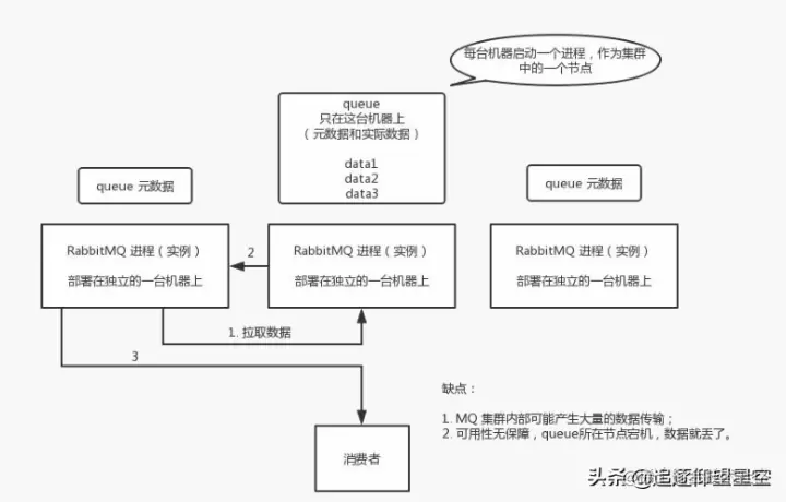 普通集群模式,意思就是在多台机器上启动多个 RabbitMQ实例,每个机器启动一个。你创建的queue,只会放在一个RabbitMQ实例上,但是每个实例都同步queue 的元数据(元数据可以认为是 queue 的一些配置信息,通过元数据,可以找到queue 所在实例)。你消费的时候,实际上如果连接到了另外一个实例,那么那个实例会从queue所在实例上拉取数据过来。