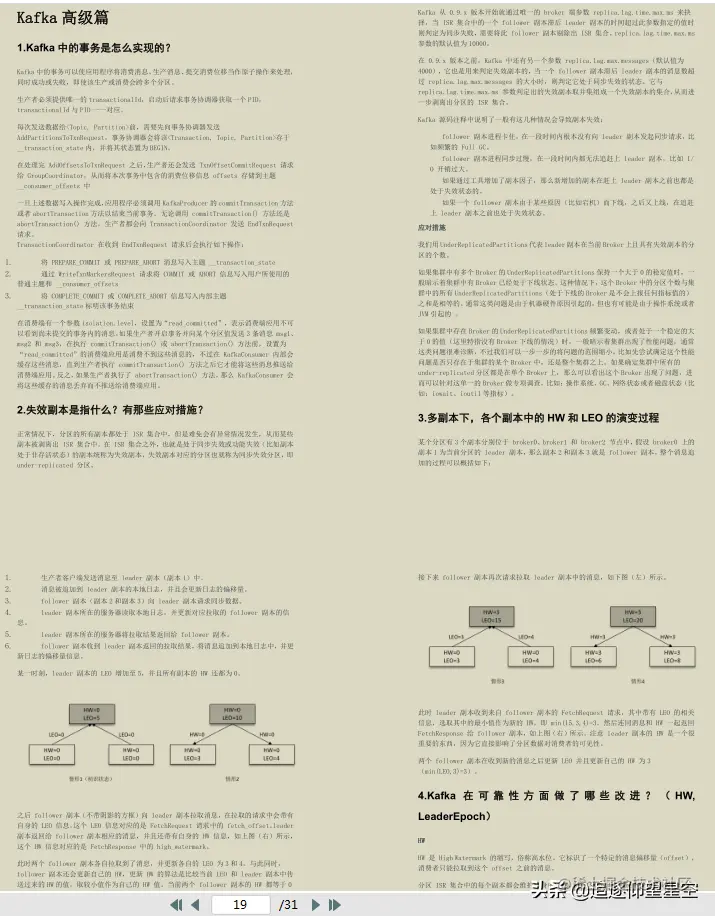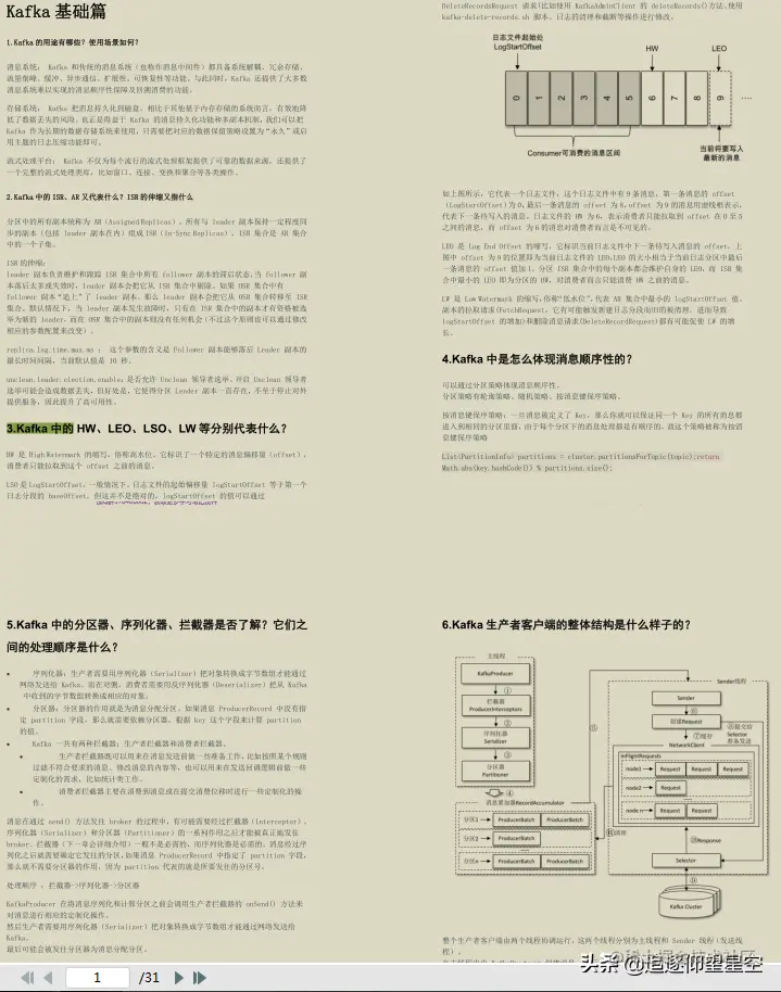 这里给出了全部的题目,关于答案解析,内容偏多(我将其整理成31页的PDF文档),篇幅有限,只截图展现部分答案解析,如需参考完整的kafka44问答案解析文档原件,点击此处获取