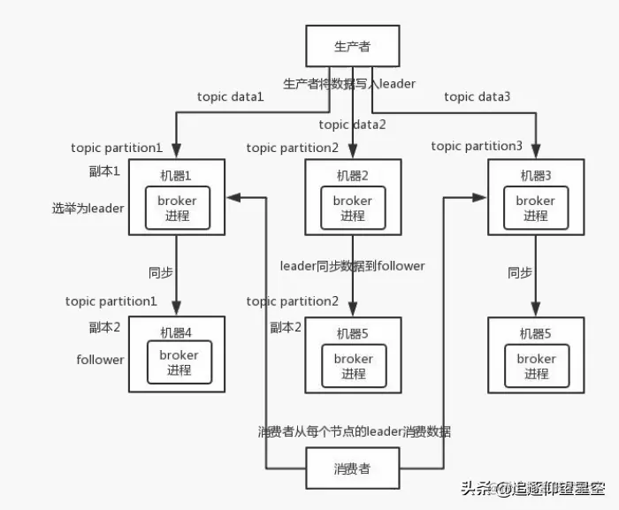 比如说,我们假设创建了一个topic,指定其 partition数量是3个,分别在三台机器上。但是,如果第二台机器宕机了,会导致这个topic 的 1/3的数据就丢了,因此这个是做不到高可用的。