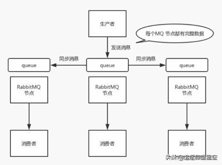 这样的话,好处在于,你任何一个机器宕机了,没事儿,其它机器(节点)还包含了这个queue 的完整数据,别的 consumer都可以到其它节点上去消费数据。坏处在于,第一,这个性能开销也太大了吧,消息需要同步到所有机器上,导致网络带宽压力和消耗很重!第二,这么玩儿,不是分布式的,就没有扩展性可言了,如果某个queue 负载很重,你加机器,新增的机器也包含了这个queue 的所有数据,并没有办法线性扩展你的 queue。你想,如果这个queue 的数据量很大,大到这个机器上的容量无法容纳了,此时该怎么办呢?