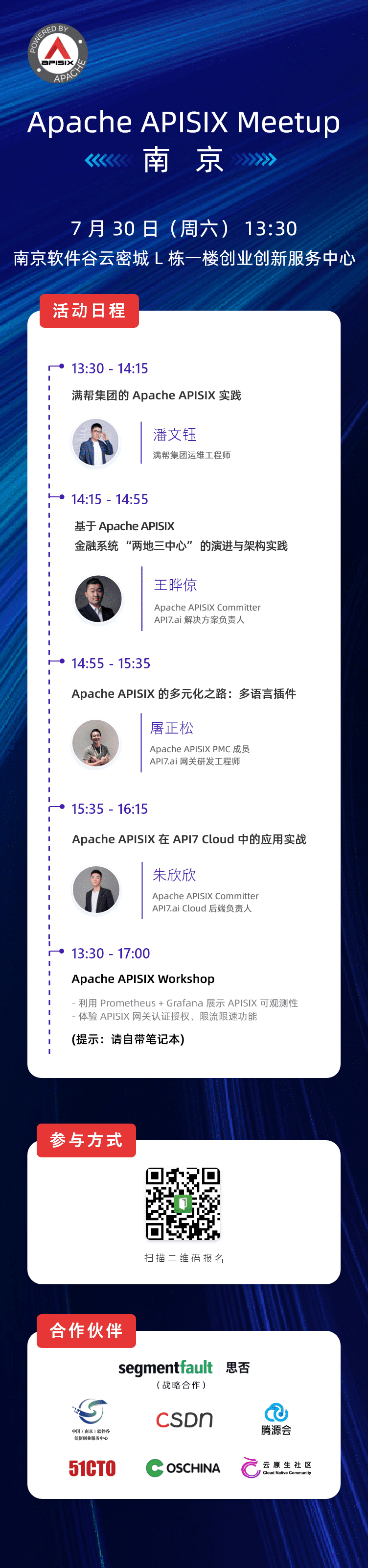 7 月 30 日,Apache APISIX 社区将于南京开启今年首届线下 Meetup,活动邀请到来自运满满和Apache APISIX 社区的资深开发者们,共同分享 Apache APISIX 的技术前沿及在不同使用场景下的实践案例。现场也特别设置了 Workshop 环节,来自社区的技术专家将近距离与众多开源爱好者们一起体验 APISIX。
