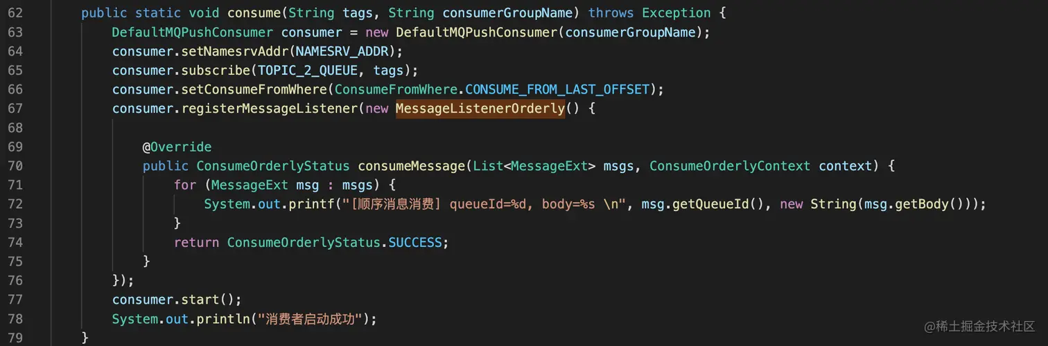 消费者使用相对比较简单, 消息监听类实现org.apache.rocketmq.client.consumer.listener.MessageListenerOrderly接口即可。相同queue的消息需要串行处理,这样救保证消费的顺序性