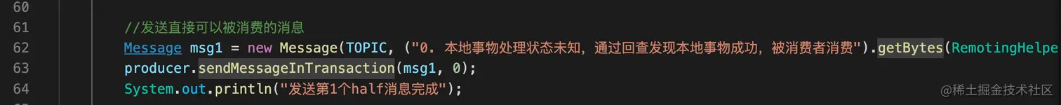 - 发送事物消息。调用sendMessageInTransaction()方法发送事物消息, 而不是以前的send()方法。