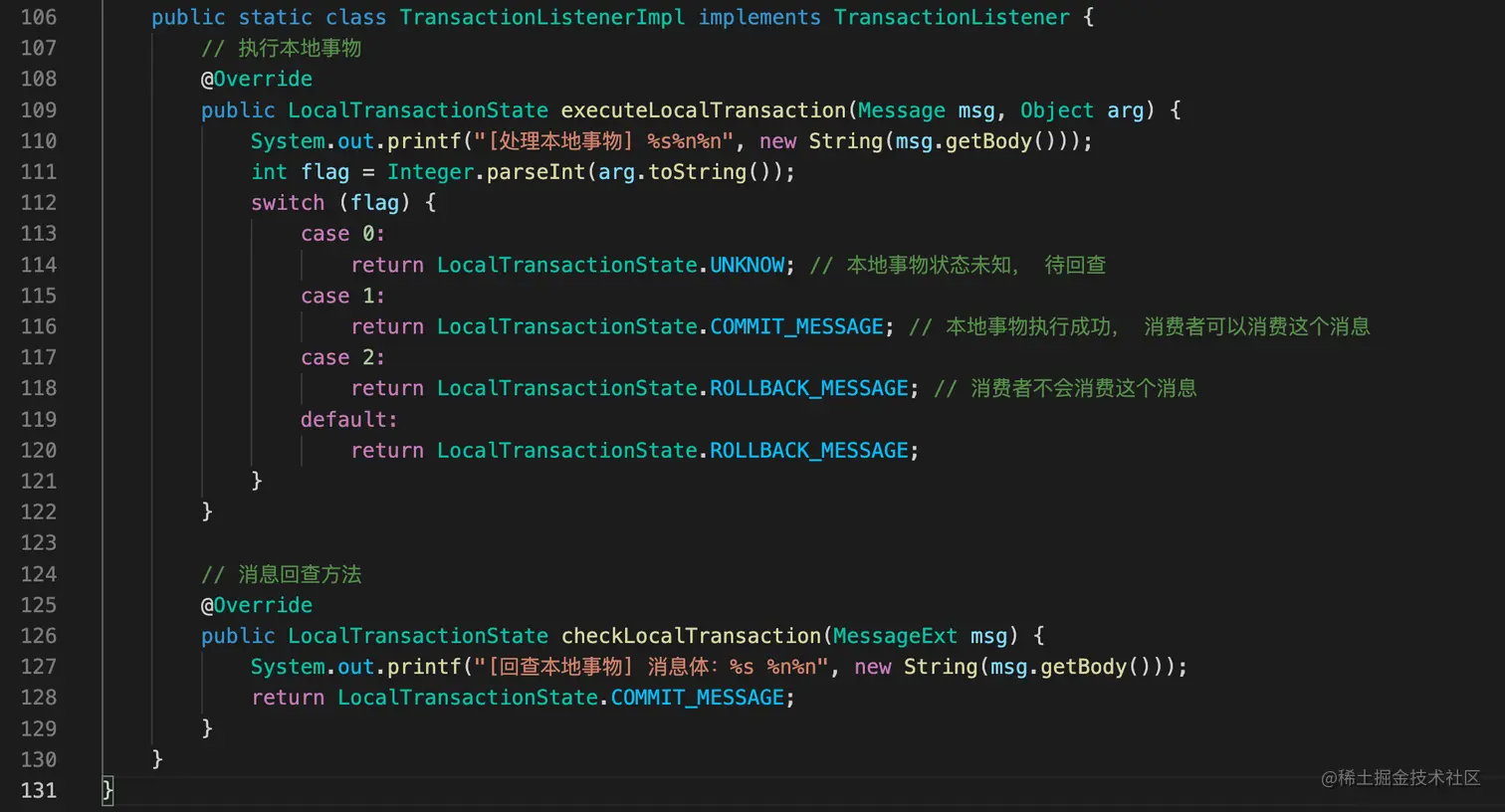 Demo代码可以查看github。在事物消息中,消费代码和普通消息的消费一样,主要代码在生产者端。