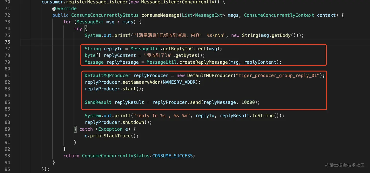 消费者demo主要代码: 消费代码主要增加了“回复”逻辑。回复是利用消息发送直接向生产者发送一条消息。 有点类似事物消息中broker回查生产者。