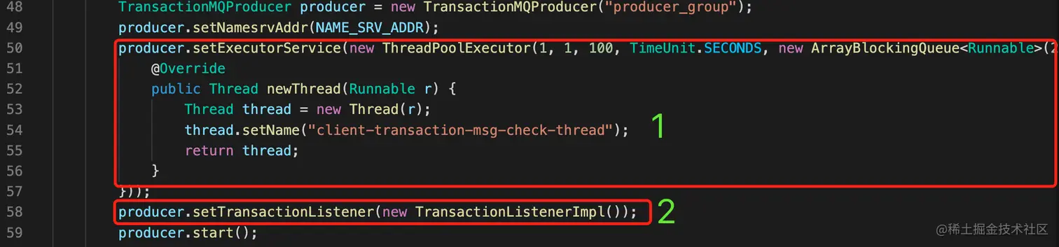 - 初始化生产者,设置回调线程池、设置本地事物处理监听类。