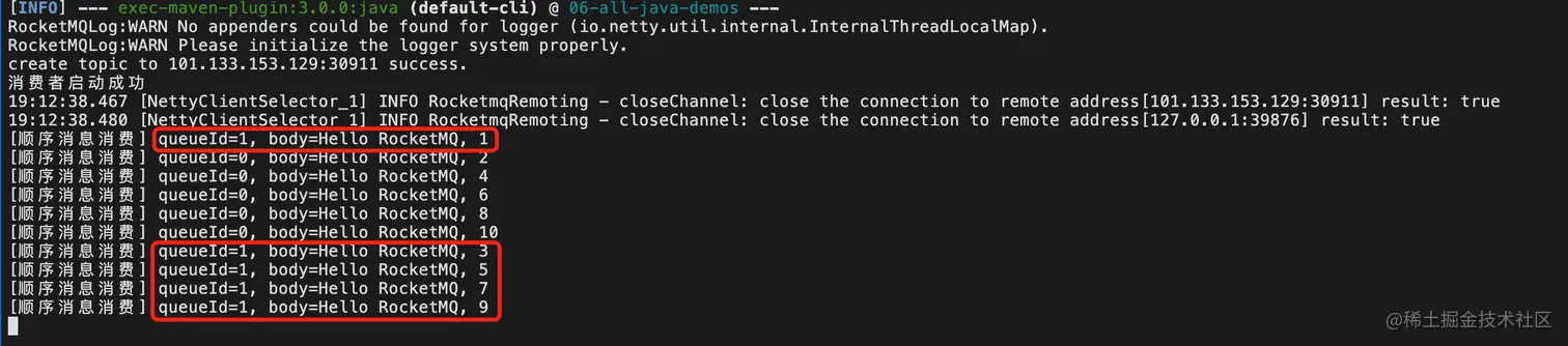再执行命令, 可以看到正常生产和消费输出。 消费输出注意看相同queue id的消息输出内容中的数字,按照从小到大就是正确的。