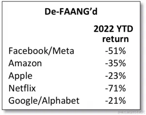 在 2020 年最初的新冠疫情封锁之后,股市的非凡表现主要是由五家企业领导的,这些企业受益于人们”假装“在家工作。 从3 月份市场的 2020 年低点开始,这些所谓的 FAANG 股票(Facebook、亚马逊、Apple Netflix 和谷歌)在该年剩余时间内平均上涨了 125%。然而这些股票的暴涨表现在今年突然逆转,为我们提供了将META添加到投资组合中的机会。(Meta前身Facebook)