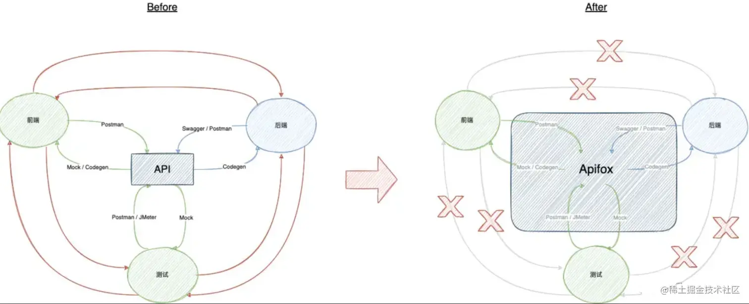 在 Apifox 之前,为了达成对 API 语义上的理解和实现上的一致性,前端、后端、测试使出十八般武艺,定义 API 用 Swagger,生成文档用 YAPI,前端自测用 Mock,接口测试用 Postman,性能测试用 JMeter,各类配置、数据、链接满天飞,重要的事情说三遍啊说三遍。有了 Apifox 之后,前端、后端、测试之间原本是去中心化的 P2P 通讯方式变成以 Apifox 为中心的新型通讯方式,通讯对象从原本充满不确定性的人,变成稳定可靠的平台,各类配置、数据、链接也有了统一管理的地方,团队通讯成本和 API 管理成本大幅降低。