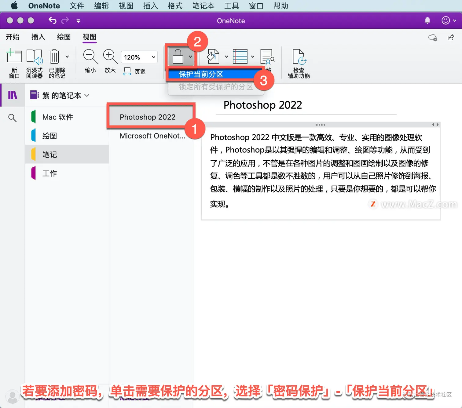 使用密码保护需要保密的笔记本分区。若要添加密码,单击需要保护的分区,选择「密码保护」-「保护当前分区」。