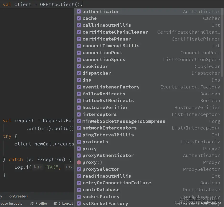 先上图,基于上次的代码,我们在 OkHttpClient() 后加上一个 . 我们就可以看到如下图的多个属性和方法。那具体他们的作用是什么呢?那就是我们本篇文章的任务了。走带着该死的好奇心,一起去瞧瞧。