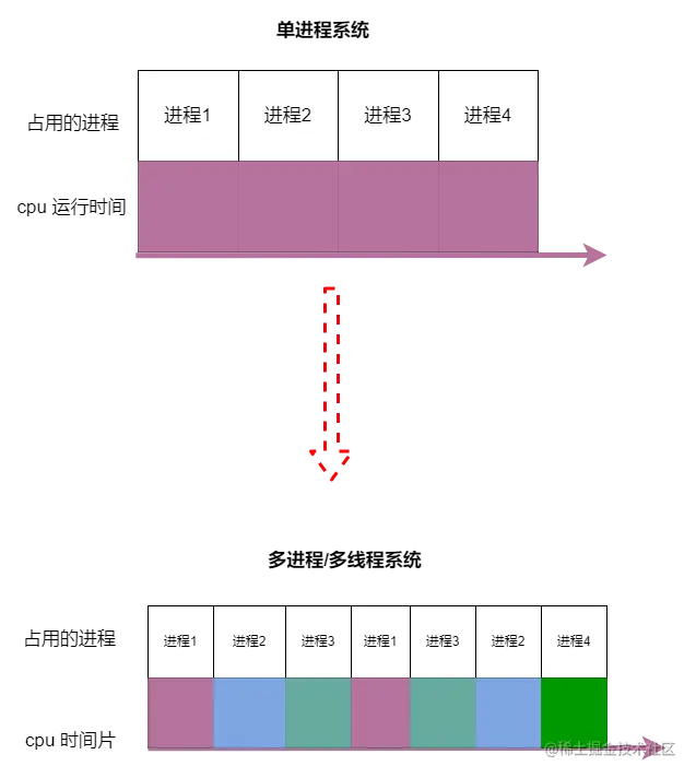 上图中我们可以对比看到,在多进程/多线程的操作系统中,cpu 的时间片被分割的更加的小,对于 cpu 资源的利用率是大大的增加了,因为 cpu 可以在进程1阻塞的时候,切换去执行进程2