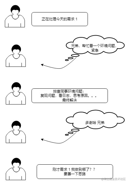 正如人的大脑,同时处理多个事项,当 事项 1 未处理完毕,就去处理事项 2,那么需要重新理清思绪去执行,若这个时候又需要切换到 事项 1 的时候,就需要花更多的时间来回顾之前事项 1 处理的上下文了, 所以在工作中,没有特别必要,不要打扰别人