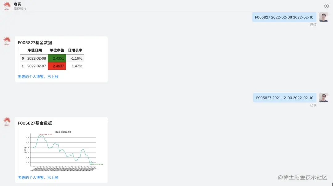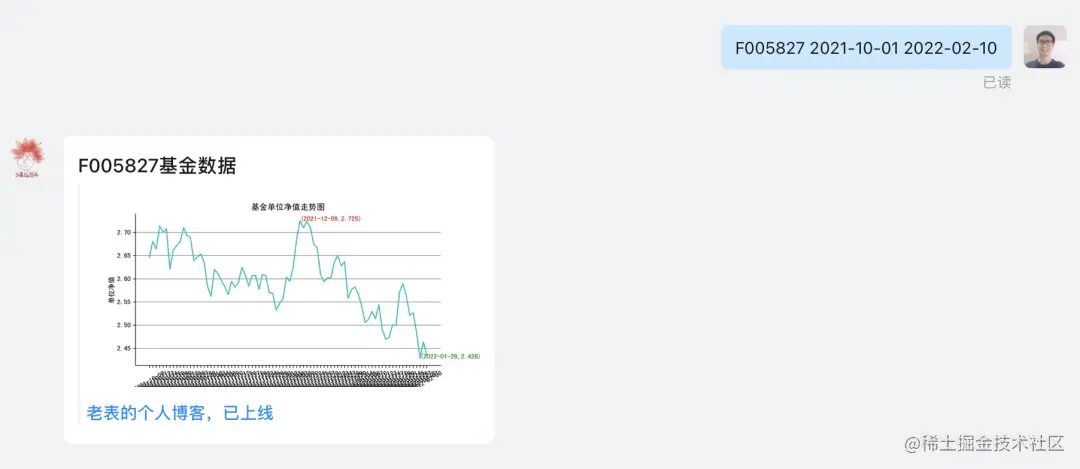 老早就想搞个基金监控机器人了,方便自己查看自己关注基金的各种指数涨跌情况,及时进行止损或者止盈,从今天开始,我们先建楼基,手把手带大家实现一个基金查询机器人,目前主要可以查询基金指定日期段数据和查看基金净值走势图,后面慢慢新增功能。