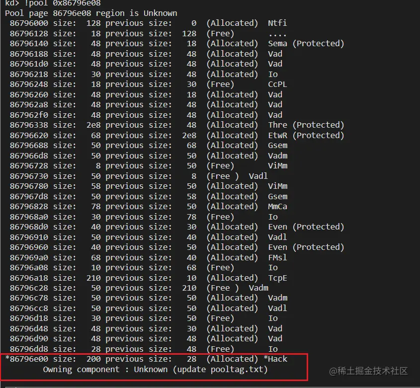 给内核漏洞函数下断点,执行到分配缓冲区结束,查看池信息: