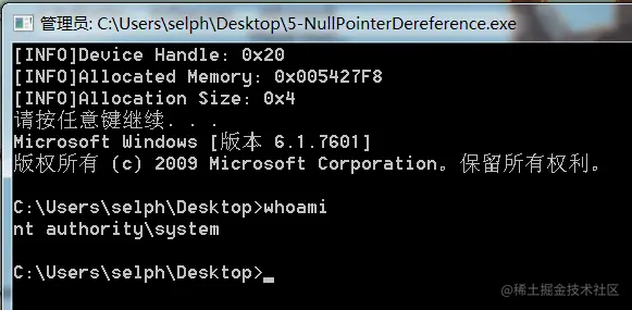 使用上一篇HEVD池溢出相同的方法,进行0地址映射,这里只需要输入一个错误的4字节,就会进入漏洞触发区域,就会去执行0+4地址的函数地址,这里只需要去这个位置提前写好shellcode地址即可完成利用,利用代码如下: