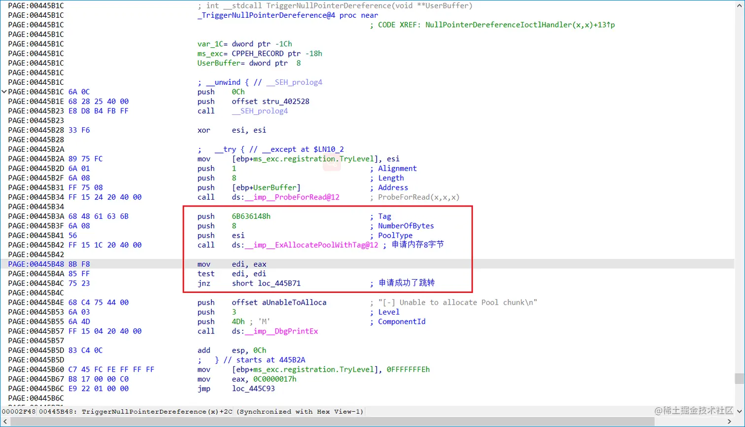 本次实验内容是NullPointerDereference,IRP分发函数通过跳转表进行跳转,使用的控制码是:0x22202b,该示例调用:NullPointerDereferenceIoctlHandler->TriggerNullPointerDereference,漏洞分析