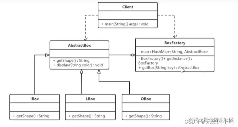 - 享元工厂:负责创建和管理享元角色,当需要具体享元对象时,先获取享元工厂,再检查享元工厂中是否存在该对象,若存在再从享元工厂中去获取对象。