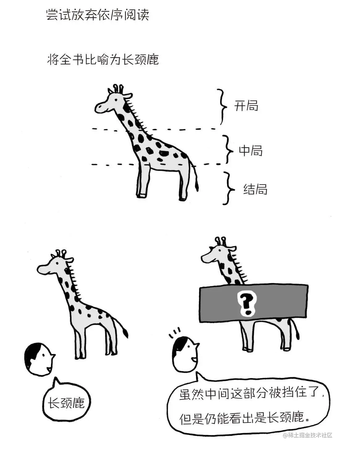 有时候,也会出现文意衔接不上的情况,这时就可以再回头浏览一下中局的内容。另外,通过确认开局和结局各5行的内容,就能够判断自己是否需要阅读这一单元。如果开头、结尾各读5行后,发现这里很重要,再返回单元开头认真阅读即可。这便是流水式阅读的第二个秘诀。