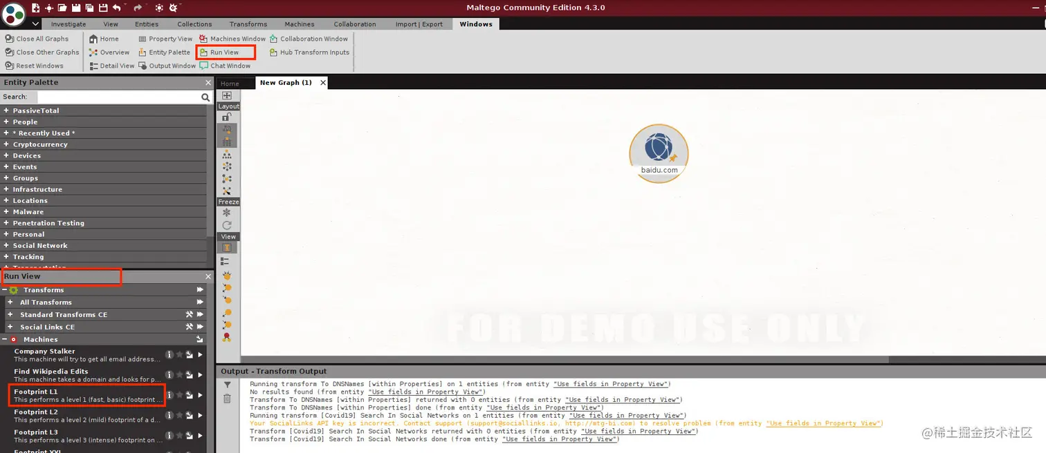 单击“Run View”按钮之后,弹出来的“Machines”菜单中,列出了Maltego提供的几种比较经典的信息搜集方式,最为常用的是Footprint系列,其中后面的数字越大,调查的深度也越大,这里点击Footprint L1。