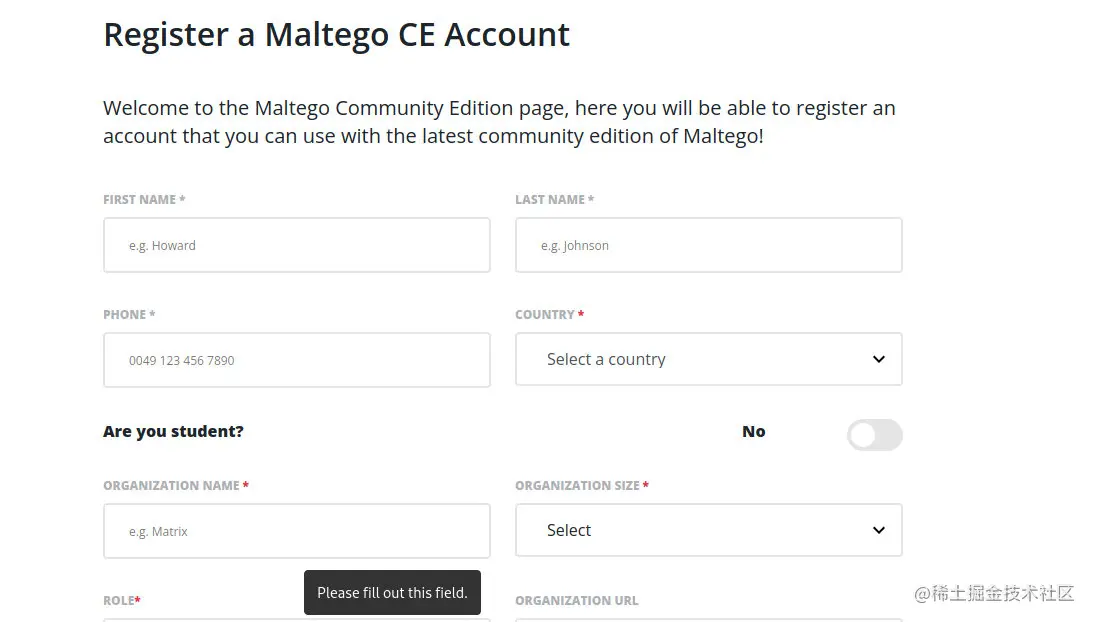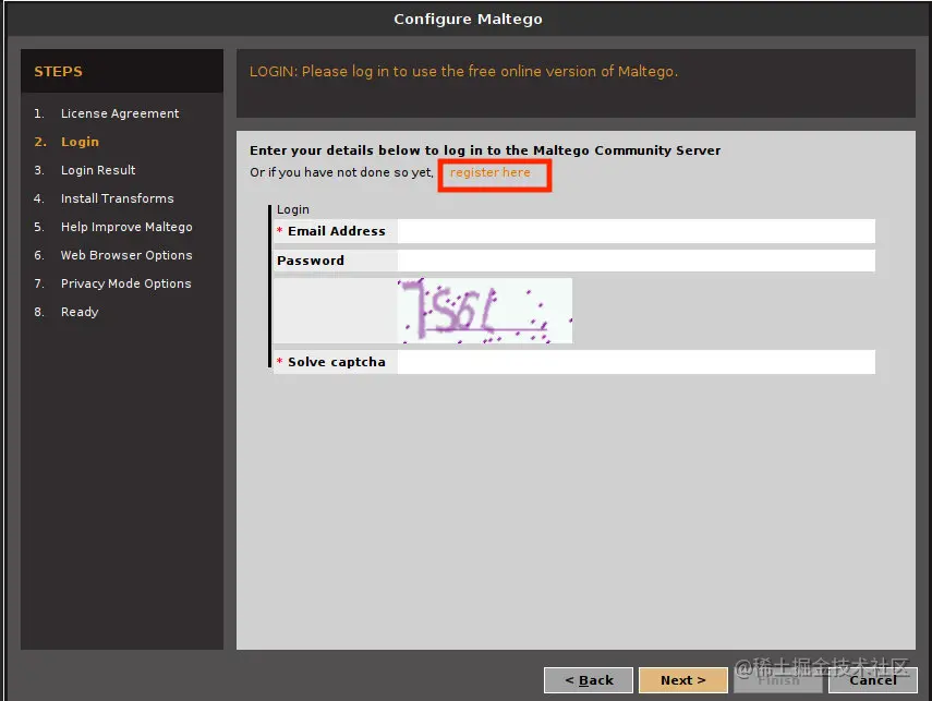 然后会出现一个登录界面,如下图所示,如果用户第一次使用Maltego,需要注册一个账户,单击红框内的“register here”就会跳转到另一个界面。