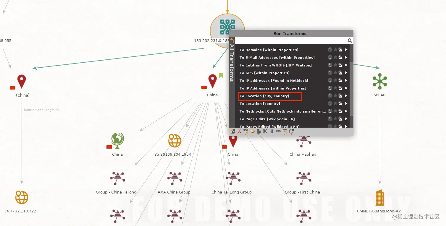 如果想知道IP地址183.232.231.0-183.232.231.255所处的地理位置,可以在这个节点上鼠标右键,然后在弹出快捷菜单中选择“To Location[city, country]”,就可以对这个位置进行定位。如下图所示:
