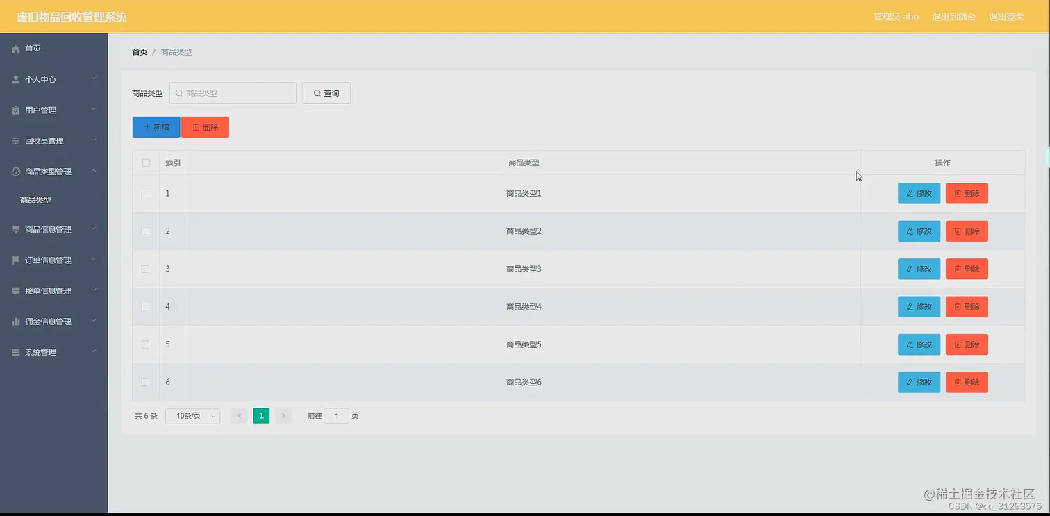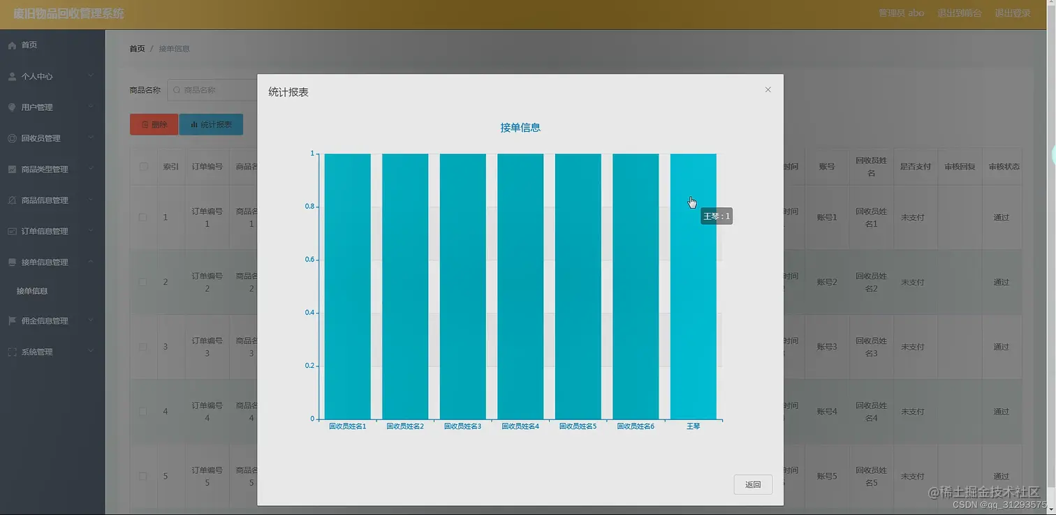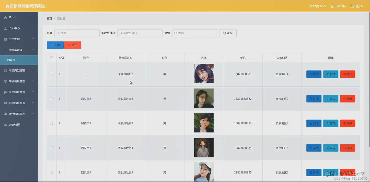 管理员管理功能:首页、个人中心、用户管理、回收员管理、商品类型管理、商品信息管理、订单信息管理、接单信息管理、佣金信息管理、系统管理等。