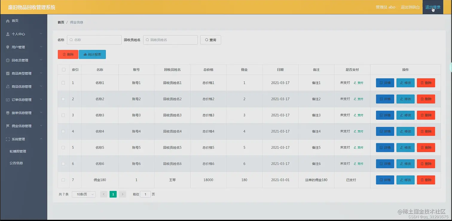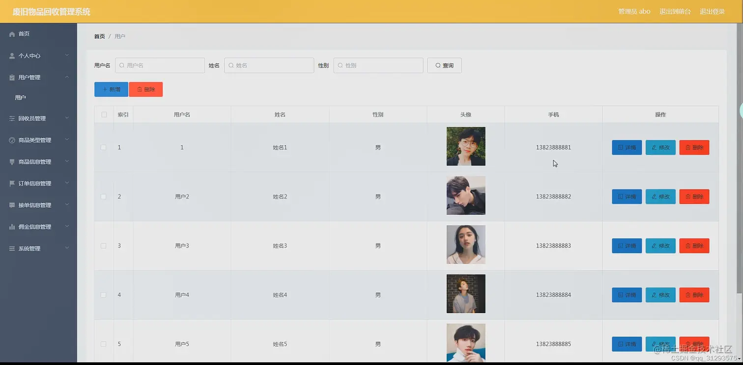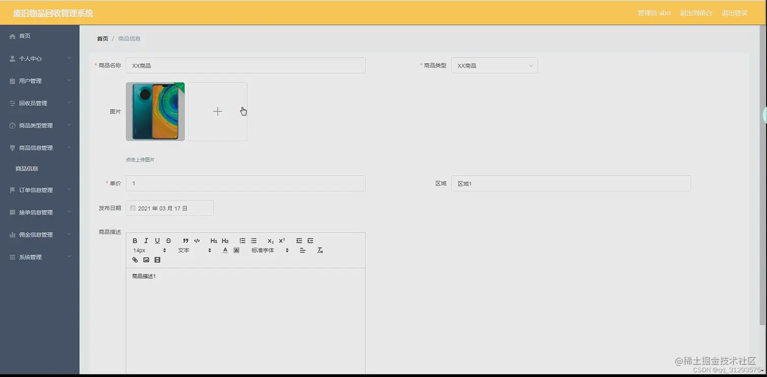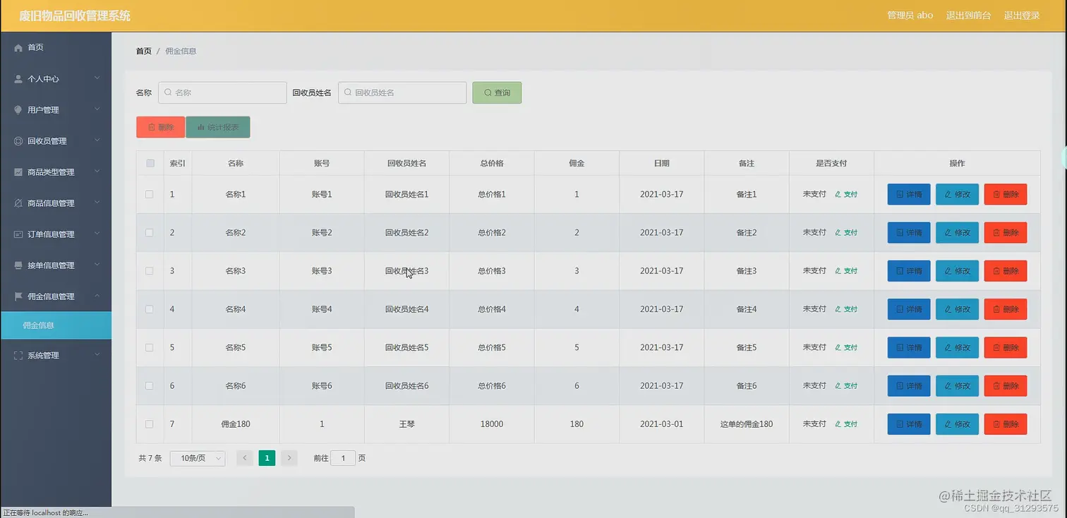 管理员管理功能:首页、个人中心、用户管理、回收员管理、商品类型管理、商品信息管理、订单信息管理、接单信息管理、佣金信息管理、系统管理等。