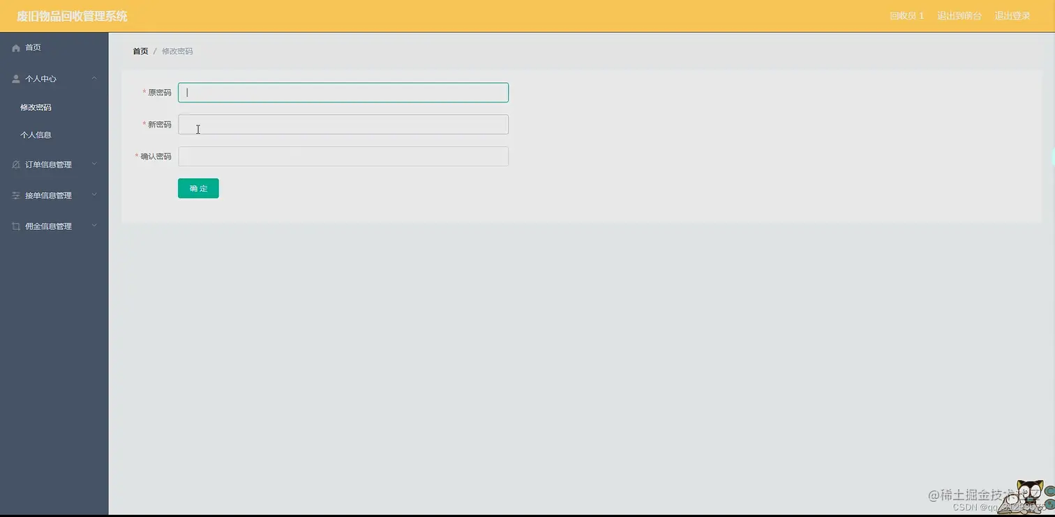 回收员使用功能:首页、个人中心、订单信息管理、接单信息管理、佣金信息管理等。
