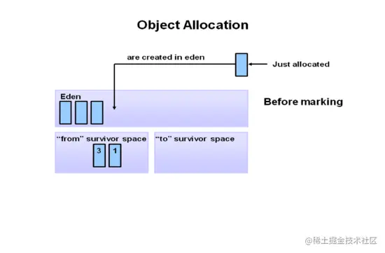 - 伊甸区Eden:所有新创建的对象都在此处分配内存。