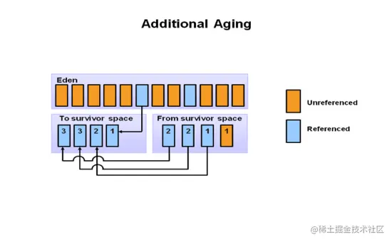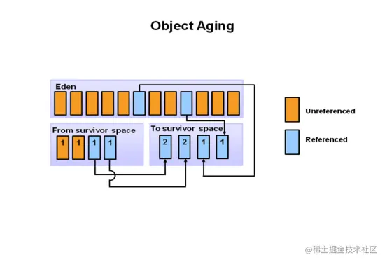 这个过程会一直进行下去,直到某个存活对象的年龄达到了某个阈值,然后它就会被移动到一个叫做“老年代”的地方,这是通过一个叫做“晋升”的过程来完成的。