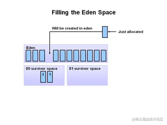 S0 中的对象年龄为 1,因为它们挺过了一次次要回收。此时,伊甸区和 S1 都是空的。
