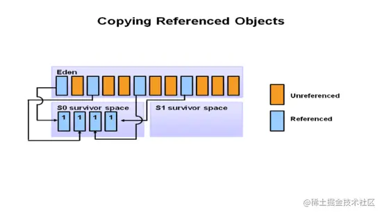 - 幸存者区Survivor,分为 S0 和 S1:经历过一次垃圾回收后,仍然存活的对象会被移动到两个幸存者区中的一个。