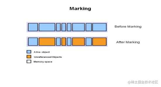 在这一步骤中,已使用和未使用的对象会被分别做上标记。这是一个及其耗时的过程,因为需要扫描内存中的所有对象,才能够确定它们是否正在被使用。