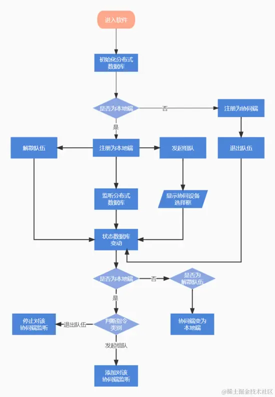 主要流程如上图,核心就是分布式状态数据库和分布式音乐演奏数据库,通过监听这两个数据库实现组网间设备的组队和协同演奏功能。分布式状态数据库用于组队信息的传输,分布式协同演奏数据库用于乐器模拟按键信息的传输。
