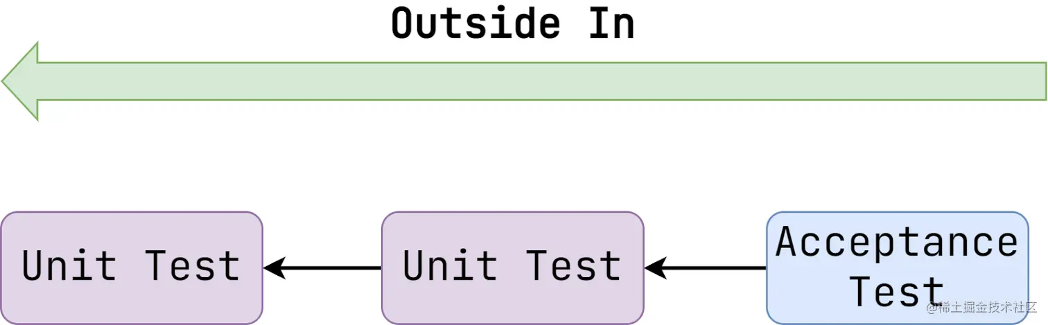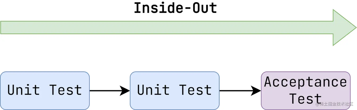 伦敦TDD学派将这种范式颠倒过来(即由外向内)。它宣称,应用程序开发应该从API开始。而领域模型则是在最后一刻才开发。请看下面的图表。