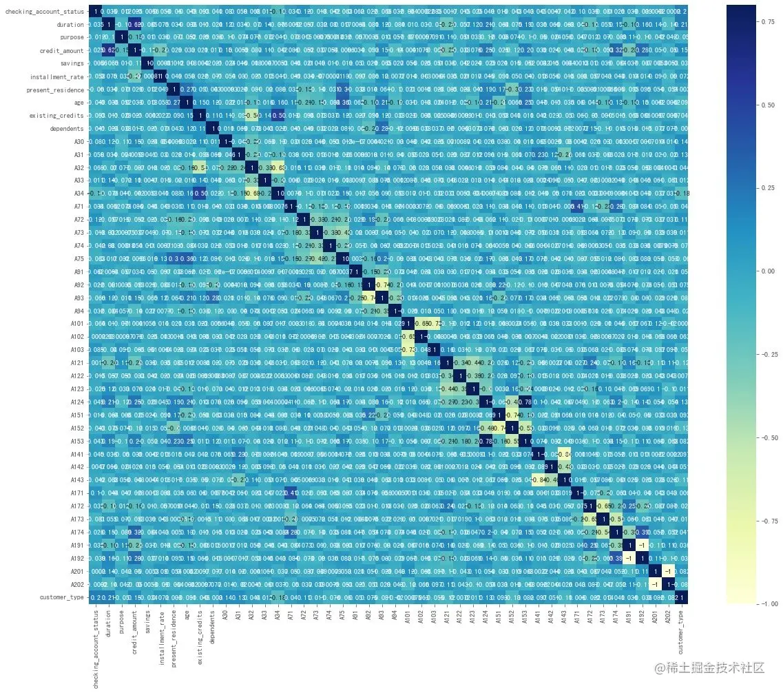 特征向量中文:1.支票账户状态;2.借款周期;3.历史信用;4.借款目的;5.信用额度;6.储蓄账户状态;7.当前就业状态;8.分期付款占可支配收入百分比;9.性别与婚姻状态;10.他人担保信息;11.现居住地;12.财产状态;13.年龄;14.其他分期情况;15.房产状态;16.信用卡数量;17.工作状态;18.赡养人数;19.电话号码注册情况;20.是否有海外工作经历