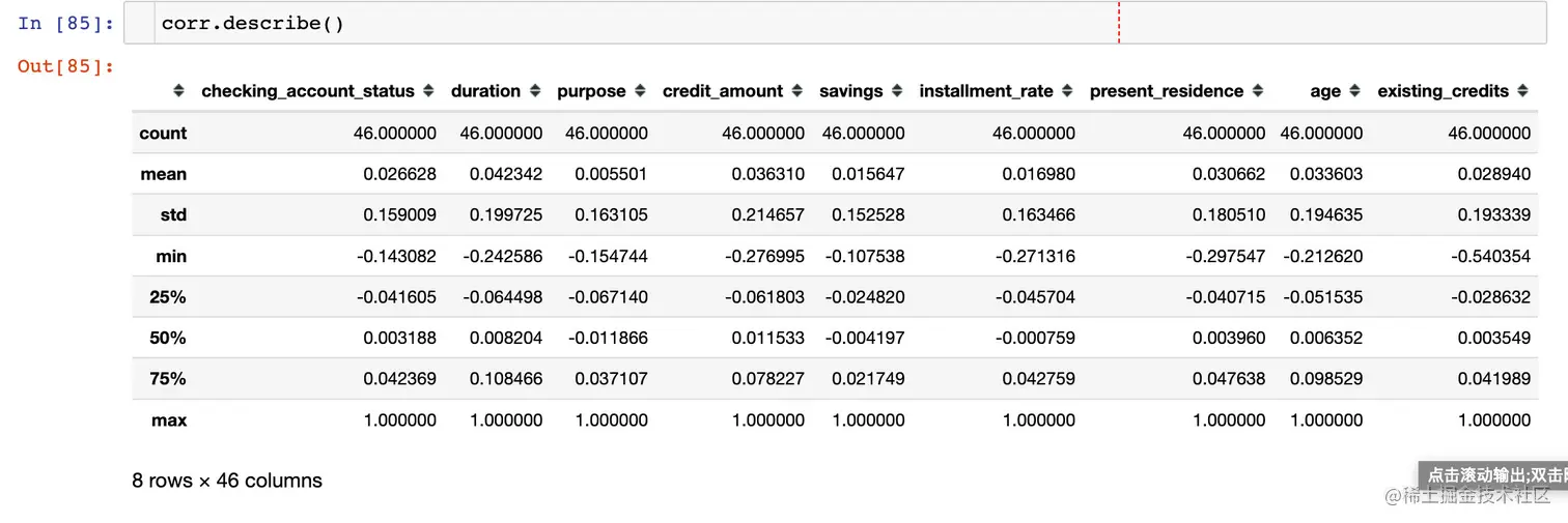 相关系数的描述统计信息:发现整体的相关系数(绝对值)都比较小