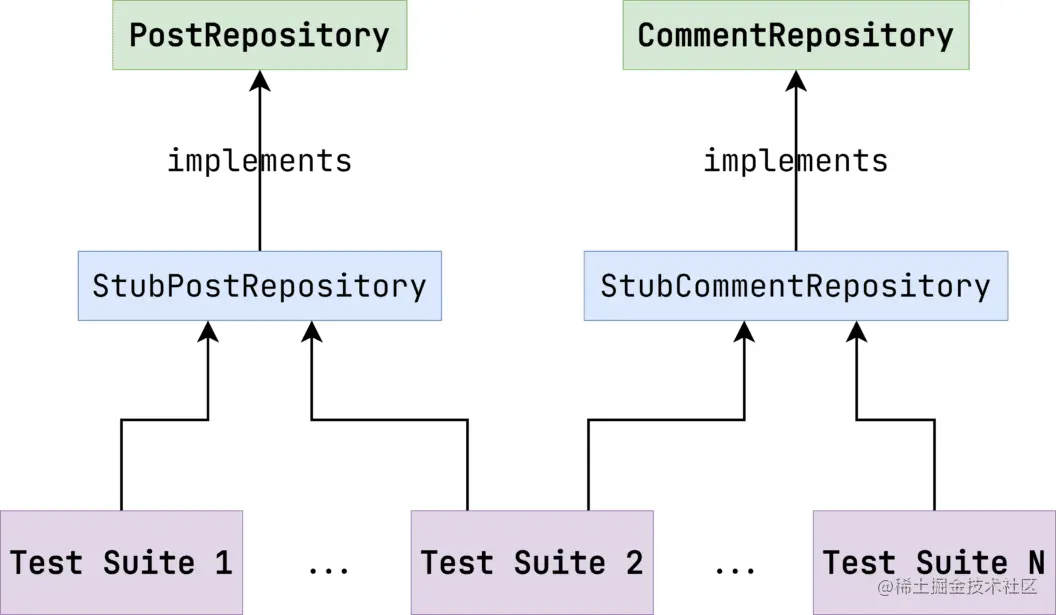 在这种情况下,StubPostRepository 和StubCommentRepository 是用于测试案例的相应接口的实现。顺便说一下,底特律学校并不限制应用于真正的商业类。