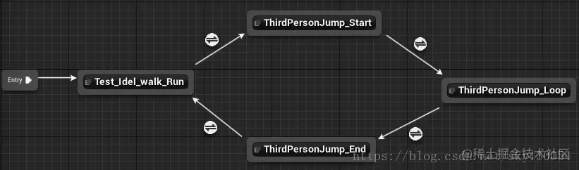 再进入结束跳跃与混合状态的双箭头,作如下连接,实现当结束跳跃动画播放到剩10%时就播放走跑混合动画