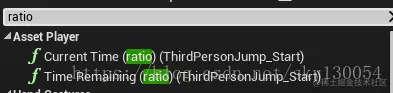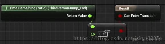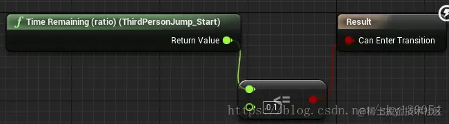 添加一个“Time Remaning(ratio)(ThridPersonJump_Start)”节点,该节点返回值为0时表示动画播放完成,通过返回值判断,当起跳状态播放剩下10%时进入循环状态