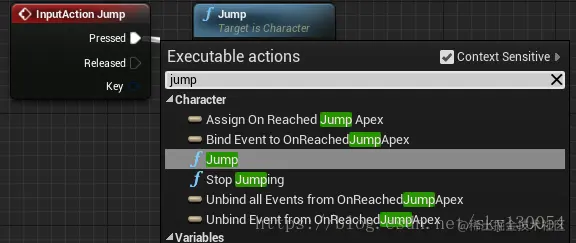 进入“Test_Character”添加一个跳跃输入时事件,调用一个Character的Jump函数