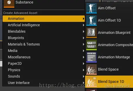 由于“站立”、“走”、“跑”等状态是由于人物速度的不同而产生改变的,因此可以创建一个动画混合空间将他们联系起来,所以创建一个“Blend Space 1D”