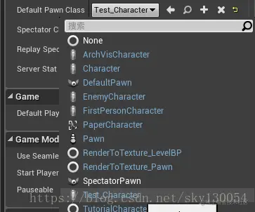 进入新的“Test_GameMode”将“Default Pawn Class”选择为刚创建的“Test_Character”