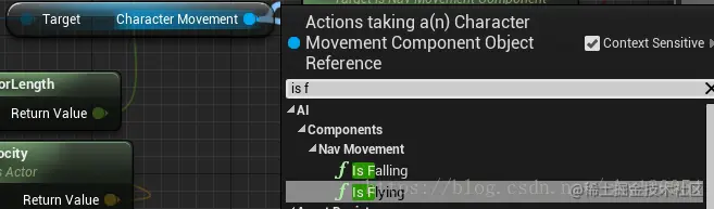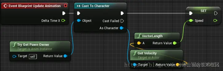 接下来要通过角色的速度控制动画的播放,先获取角色当前速度,在事件图表设置如下节点。