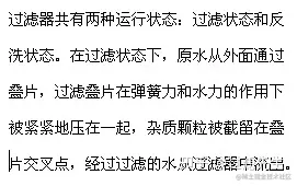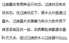 过滤单元是由多个PP过滤叠片叠加而成,每片叠片上都有很多沟与槽。叠片上的沟与槽编制成的交叉点将水中的杂质拦截,起到过滤作用。过滤叠片都贯穿于同一内撑上,过滤单元顶部有一组弹簧,在过滤液体的压力和弹簧压力的综合作用下,叠片间可以压紧或松开,压紧时有利于高精度过滤,松开时有利于反冲洗。叠片的凹槽及突出点都做到整齐,这样使过滤精度正确,过滤效率好。