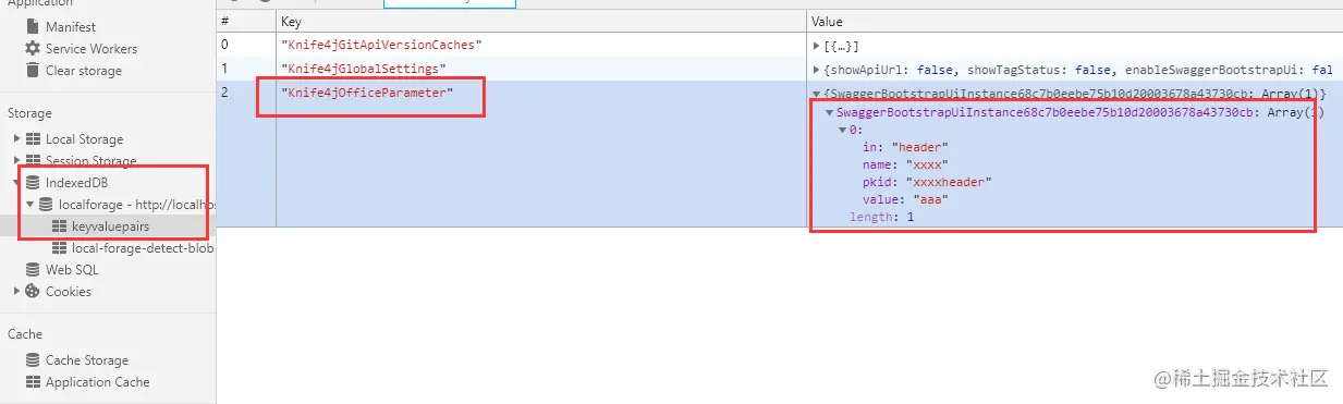 框架后端针对系统管理员增加一个根据用户直接生成token的接口,将获取到的token通过js方式直接附加到knife4j的全局参数中,这样就只需要点击获取token按钮我们就可以直接进行任意接口的调试工作,通过f12分析发现,knife4j的全局参数变量是存储在浏览器数据库IndexedDB中,数据表为keyvaluepairs,对应的数据行key为Knife4jOfficeParameter