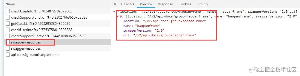 上述的name,location,version三个值是通过请求swagger-resources接口获取的,返回值为一个数组,根据选择的group去匹配