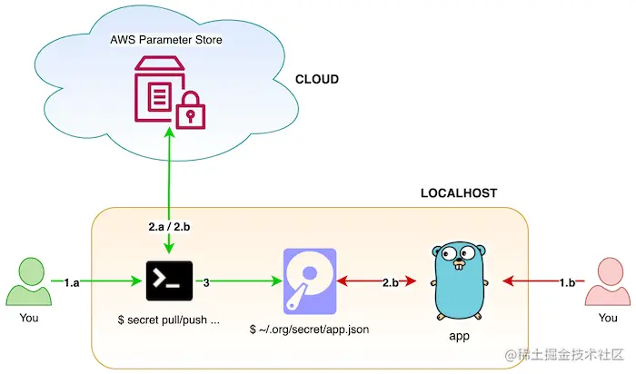 远程秘密存储是我们要存储秘密的地方。我们将使用AWS SSM服务,但它可以是任何其他服务,如Vault、Azure、GCP等。当用户提取秘密时,它们将被保存在本地机器的JSON文件中,使用SSH密钥来加密值。当应用程序运行时,该文件将被读取、解密并映射到结构中。